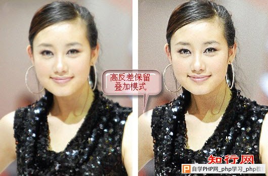 说明:图层混合模式中第四组对比度组:叠加、线性光等等,这些模式的特性是:本图层和下面图层混合之后,本图层中的黑、白能保留下来,灰色将过滤掉。结合本案例,图层1中执行高反差之后有大量灰需要去除,因此将模式设置为叠加就达到效果了。