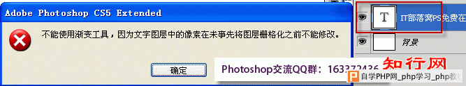 如果我们输入完文字,直接使用工具箱中的“渐变工具”,Photoshop会弹出一个提示框:“不能使用渐变工具,因为文字图层中的像素在未事先将图层栅格化之前不能修改。”。在文字图层,单击鼠标右键,选择“栅格化文字”,转换为普通图层,按ctrl键单击图层缩览图,载入文字选区,就可以正常使用渐变工具进行填充了。