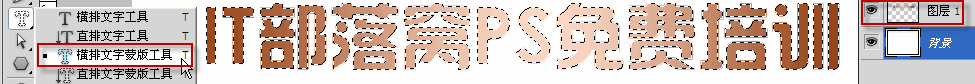 我们在PS工具箱中找到文字工具,里面有四种类型:横排文字工具、直排文字工具、横排文字蒙版工具、直排文字蒙版工具。其中前两个输入文字时,会自动建立一个文字图层,后面两个是在现有图层增加文字选区。