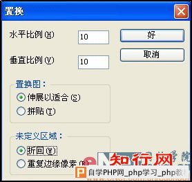6、选择菜单栏中的“滤镜”“扭曲”“置换”命令,设置弹出的对话框如图06所示,单击确定按钮,在弹出的对话框中选择刚才保存的PSD文件并单击确定按钮,画面效果如图07所示。