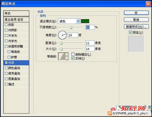 9、单击“添加图层样式”按钮,在弹出的下拉列表中选择“光泽”命令,设置弹出的对话框如图10和11所示。