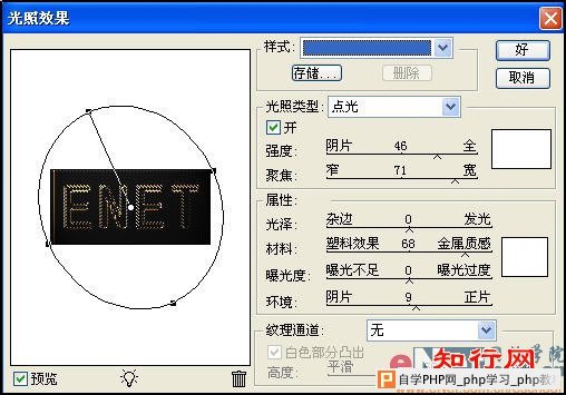 12、按Shift+Ctrl+Alt+E键执行“盖印可见图层”操作,在所有图层上方得到一个新得图层“图层4”。选择菜单栏中的“滤镜”“渲染”“光照效果”命令,设置如图16所示,得到最终效果如图17所示。