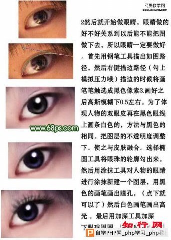 2、眼睛部分处理,眼睛做的好不好关系到以后能不能把图做下去,所以眼睛一定要做好。首先用钢笔工具描出如下图第二幅所示的路径,右键描边路径,勾选模拟要来。描边的时候将画笔笔触选出成黑色像素3.画好之后高斯模糊下0.5左右。为了体现人物的双眼皮,再在黑色眼线上画条白色的,方法与黑色的相同。把图层的不透明度调整下,使之与皮肤融合。选择椭圆选框工具将眼珠的轮廓抠出出来,用涂抹工具对人物眼睛进行涂抹,新建一个图层,用黑色的画笔画出瞳孔,然后用白色画笔画出高光。最后用加深工具加深下眼球周围。眼睛完成。