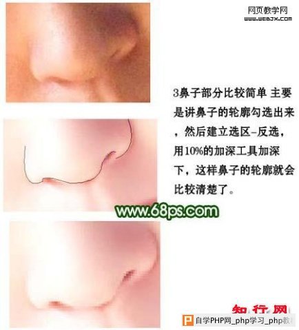 3、鼻子部分比较简单,主要是将鼻子的轮廓勾选出来,然后建立选区,按Ctrl + Shift + I反选,用10%的加深工具加深下,这样鼻子的轮廓就会比较清楚了。