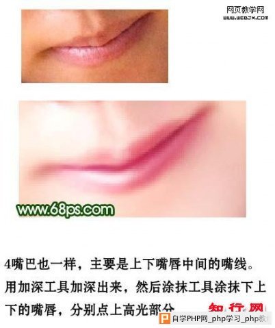 4、嘴巴也一样,主要是上下嘴唇中间的嘴线。用加深工具加深出来,然后用涂抹工具涂抹下上下嘴唇,分别点上高光部分。