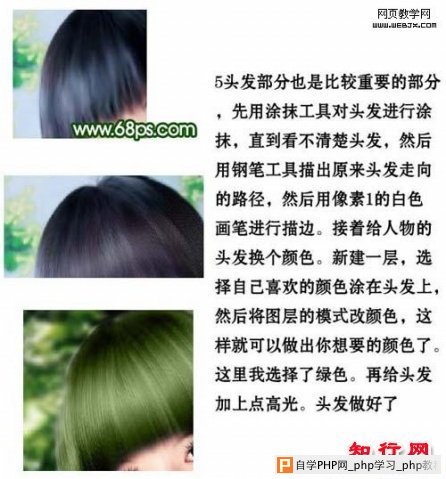 5、头发部分也是比较重要的部分,先用涂抹工具对头发进行涂抹,直到看不清楚头发,然后用钢笔工具描出原来头发走向的路径,用像素 1的白色画笔进行描边。接着给人物的头发换个颜色。新建一层,选择自己喜欢的颜色涂在头发上,然后将图层的模式改为“颜色”,这样就可以做出你想要的颜色了。这里我选择了绿色。再给头发加上点高光,头发就做好了。