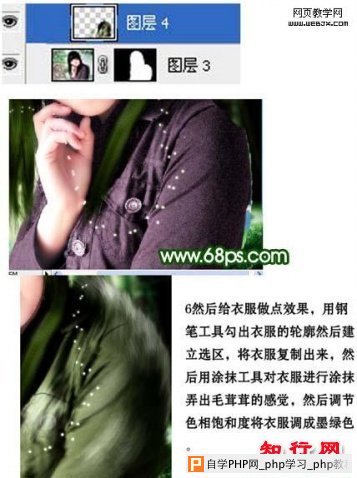 6、给衣服换颜色,用钢笔工具勾出衣服的轮廓,然后建立选区,将衣服复制出来,用涂抹工具对衣服进行涂抹,弄出毛茸茸的感觉,再调节下色相/饱和度将衣服调成墨绿色。