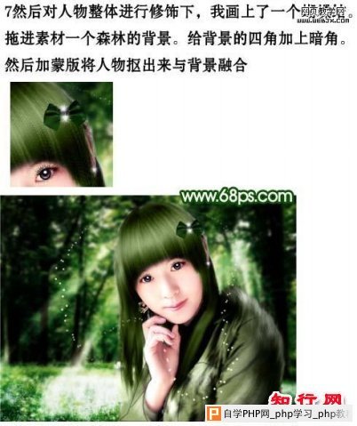 7、对人物整体修饰下,我画了一个蝴蝶结。拖进素材,一个森林的背景,给背景的四角加上暗角。然后加蒙版将人物抠出来与背景融合。