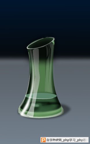 7,花瓶的底座比较厚,受光线的影响是变化很大,一定要对玻璃类光线折射等方面熟悉才能做出逼真效果,用钢笔工具勾出底座厚度,填充#517A4B色,并用加深和减淡工具对局部进行加深减淡处理.