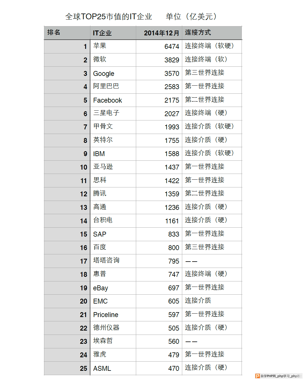 我对三个世界相互交叉连接的当下看法:三个世界的交叉连接代表 AR,智能机器人,VR 中,AR 的价值应用场景还比较有限,基础连接还没完全到位,VR 除了游戏之外也很难快速切入,特别是对人体的健康伤害不彻底解决,瓶颈很大,两者都还面临着非常大的挑战,唯一最具可行性的当下反而可能是家用智能机器人的尝试。 另外,畅想下未来的话,个人一直偏执的认为,人类未来必然会将三个世界融合,也就是第一第二第三世界融为一体,我是赞同雷库兹韦尔的人机(脑机)结合观点的,未来的生命必将是混合生命。人类本身也将被彻底数字化,固态生命虚无化,现实与虚拟皆是假象,这已涉及到哲学范畴,在此不作深度讨论,感兴趣者可观看一部电影《The Thirteenth Floor》。 3、连接一切的价值所在我对截止到 2014 年 12 月 31 日全球 TOP25 市值的 IT 企业进行了统计,其中涉及连接方式的企业(包括连接终端与连接介质)13 家,涉及三个世界连接的企业(包括第一、第二、第三世界)10 家,前者总市值 23812 亿美金,后者总市值 14530 亿美金,前者是后者的 1.64 倍。因为样本数只放到了 25 个,不一定很客观。但是有一点可以肯定的是,随着连接方式与三个世界的连接都将在未来几年发生重大变化时,这个榜单也会发生很大的变化。