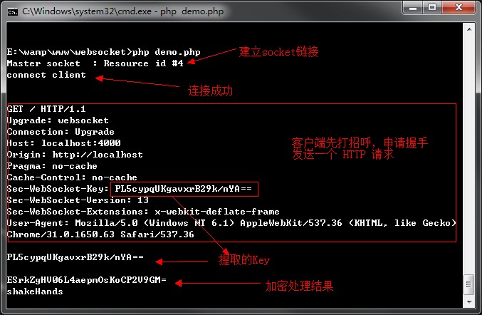};运行服务器代码,当客户端连接的时候,我们可以看到: 2. 提取 Sec-WebSocket-Key 信息 function getKey($req) {