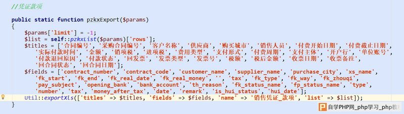 php中excel操作通用的excel导出方法实例 一.普遍导出方法 excel导出的方法网上有很多,在crm或是oa系统中导出excel是常有的事,做过的此功能人都知道,其主要操作其实是循环数据列表,然后一格一格地添加数据到固定的单元格中。只要做好了一次,其后只要复制相关代码修改修改,其他地方导出功能也就完成了。 但是这样会有两个问题: 1.当列表数据字段修改时,需要修改大量的代码,维护艰难,改着难受; 2.多次出现导出功能时,需要在多个地方复制大量的重复冗余代码,看着难受; 因此,有必要统一一个导出excel的方法,使用时,只需要传入数据的表头,表头字段名,数据列表,以及数据表名称,就能导出excel了。 二.使用通用的导出方法 如下图所示,只要传入4个参数,就能完成导出,使用和维护就变得简单多了。