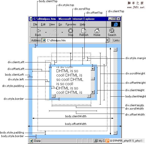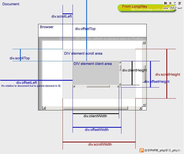 ![]() 注释1:上图整个大背景是这个网页的全部尺寸,中间的小框才是浏览器中的可见尺寸。这幅图就是针对为文档(document)的各个height、width、top、left所做的说明。 ![]() 注释2:第二幅图主要是针对网页中一个div的各个属性值所做的说明。“DIV element client area”是这个div元素的可见区域,“scroll area”是这个div内容原始尺寸,但是由于div的css所设置的高度宽度容不下它的内容,所以出现滚动条。 下面还有张更混乱的,在网上流传比较广: ![]() |