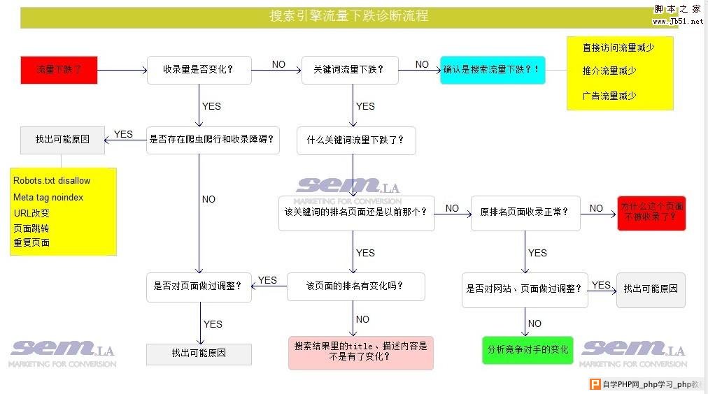 ![]() 文章不需要太多的文字,下面的文字我只对一些重点部分简单描述下。 可能有做SEO的朋友会有这样的体会:网站流量下降了,别人都会来找你问原因,可是找来找去都找不到源头——重点关键词排名还在啊,收录量没有减少啊…难道网站被降权了?在这个时候,你需要确认第一步,是否确定是搜索流量下跌了?在以前的经历中,我发现确实有朋友太敏感,明明不是搜索引擎流量异常,也折腾个半天。第一步最重要:确认是搜索流量下跌,然后才可以继续下续的诊断。 SE流量下跌,主要分析两个问题:收录量问题和关键词排名问题,其中重点的是关键词排名问题。好多朋友在确认是某些关键词的排名下降导致流量下跌后就结束了分析过程,所给出的答案也就是一份关键词名单。这不是个合格的答卷。 关键词排名下跌有两种情况:(1)某关键词排名最高的页面没有变化,原先是A页面,现在也还是,只是从第1名下降到第10名;(2)排名最高的页面不再是原页面,从A变成B了。这两种情况的原因和深入分析的需求是不一样的,希望各位朋友仔应对这些情况的时候能区别开思考。 具体的流量异常的分析、诊断过程不在这边赘述。希望每个朋友在处理异常问题的时候都能有个清晰的完整的思路,避免病急乱投医或者黑进迷宫。同时,也希望大家都能够有效的使用流量统计分析工具,譬如Google Analytics。 文章来源:http://sem.la/blog/seo-traffic-diagnosis/(注明:图片来源于SEM.LA会员中心) |
