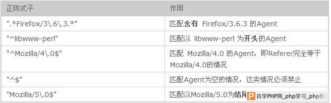 以上规则封杀了Agent中含有Firefox/3.6.3的来源,也就是包括以下例子的Agent将无法访问你的网站: Agent: Mozilla/5.0 (Windows; U; Windows NT 5.1; zh-CN; rv:1.9.2.3) Gecko/20100401 Firefox/3.6.3 以上只是个例子,切不可用于你的网站,否则使用Firefox 3.6.3的用户就不可以访问你的网站了,访问结果Http Code都是403,他们看到都是403页面,也就是禁止访问页面。这里让我来教你如何编写封杀的规则,以上语句 通过上表,你差不多也知道了个大概,在正则式子中,所有点 . 一概写成