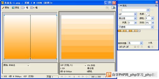 3、切换到【两幅】的预览窗口,打开Fireworks的【优化】面板,在【优化】面板中选择格式为“Gif”,【索引色调色板】为“最合适”,【颜色】可以选择“16”或“8”,这里选择的是“8”,效果如图4-133所示。