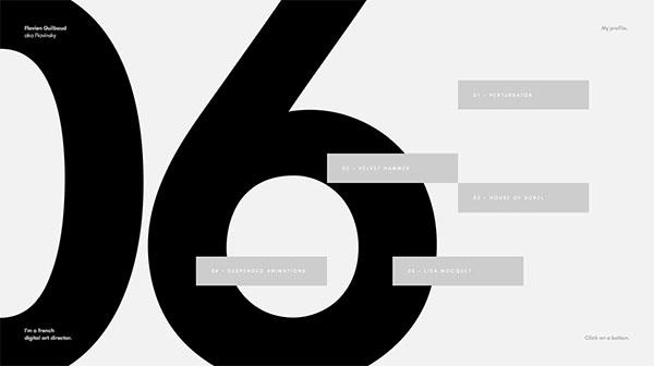 本次给大家打来,40个国外网页设计风格思路 今天的网页设计,在字体上面往往喜欢展示非常大的字体。这些开放的网站,将文本尺寸放大到极致!这个超大字体设计巧妙地扮演着两种角色,它介绍了网站标题,同时也形成了整个网站设计的一部分。您将看到这些网站如何使用背景和精巧的布局,让字体获得更大的焦点。在最近很流行的设计趋势上面,大字体设计很受欢迎,整体性很引人注目,也容易给人留下很深的印象。所以很多设计采用超大字体的形式去设计网页,下面的文章,我们收集了40个很独特的超大字体风格的网页设计,字体也是一个图形,看看这些图形如何完好的融入到网站中,希望你喜欢我们的文章!开始欣赏吧! Flavien Guilbaud