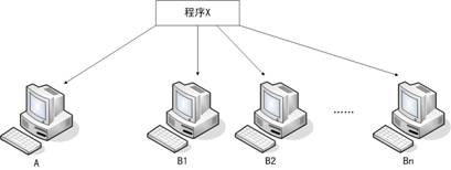 单机,即不连接到其他计算机的计算机,不在网络中。两单机A、B,只在A上安装有程序X,若要在B上得到X的运行结果,必须在B上安装一遍C,然后运行之,若B类的计算机比较多,则需要逐一安装运行,非常麻烦;它们之间不能直接进行通信和协作。如图1所示。