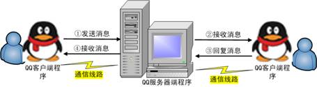 C/S程序分为两部分:服务器端部分和客户机端(以后简称客户端)部分,分别称为服务器端程序(或服务程序)和客户端程序(或客户程序)。对于客户端程序,对每一个客户机,也都需要分别安装,这一点与单机程序的分发相同,也很麻烦。但是,安装好了客户端程序后,就可以通过通信线路与服务器交互,或通过服务器,与其他客户机通信。典型的例子是大家常用的聊天程序QQ,如图3所示。