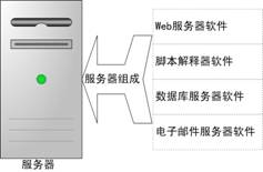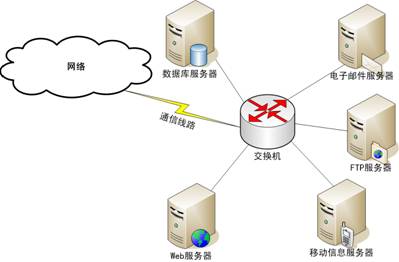 服务器,是担负服务任务的机器。这些服务任务一般专门的软件来完成。一般地,把具有某种服务功能的服务器软件及其所在的机器,都统称XX服务器(XX表示某种具体服务)。这些软件可以集中于一台机器中(如图5),这样的机器可以称为集中式服务器;也可以单独存在于某台机器中(如图6),这样的机器可以称为独立式服务器,多个独立式服务器可组成服务器群或矩阵(台湾词为“阵列”)。