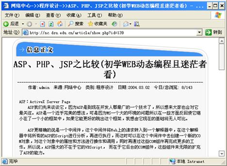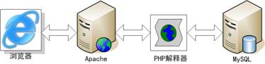 用户通过浏览器向服务器请求PHP文件(如在地址栏输入:http://211.64.40.187/index.php),Apache在服务器上的用户文档发布目录下查找浏览器所请求的PHP文件,若找不到,则向浏览器返回错误信息,否则,将其提交给PHP解释器解释执行,PHP解释器对该PHP文件进行语法分析,若发现语法错误,则经Apache返回错误信息(以浏览器能识别的代码表示)到浏览器,否则执行该PHP程序(可能包含对数据库MySQL的操作),将PHP程序执行结果(以浏览器能识别的代码表示)经Apache返回到浏览器,浏览器对返回的结果进行解释、执行,执行的结果显示在浏览器窗口中。