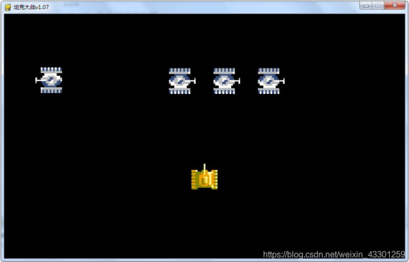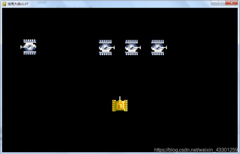 框架搭建 import pygame #主逻辑类 class MainGame(): def startGame(self): pass def gameOver(self): pass #基本坦克类 class BaseTank(): pass #我方坦克类 class MyTank(): pass #敌方坦克类 class EnemyTank(): pass #子弹类 class Bullet(): pass #爆炸类 class Explode(): pass #墙壁类 class Wall(): pass #音效类 class Audio(): pass game = MainGame() game.startGame() 展示主窗口 import pygame SCREEN_WIDTH = 900 SCREEN_HEIGHT = 550 #主逻辑类 class MainGame(): #游戏主窗口 window = None def startGame(self): #调用窗口初始化方法 pygame.display.init() MainGame.window = pygame.display.set_mode((SCREEN_WIDTH,SCREEN_HEIGHT)) pygame.display.set_caption('坦克大战v1.02') while True: #填充窗口背景色 MainGame.window.fill((0,0,0)) #刷新 pygame.display.update() def gameOver(self): pass 事件监听 class MainGame(): #游戏主窗口 window = None def startGame(self): #调用窗口初始化方法 pygame.display.init() MainGame.window = pygame.display.set_mode((SCREEN_WIDTH,SCREEN_HEIGHT)) pygame.display.set_caption('坦克大战'+VERSION) while True: #填充窗口背景色 MainGame.window.fill((0,0,0)) #调用事件处理方法 self.getEvents() #刷新 pygame.display.update() #所有事件处理的方法 def getEvents(self): #获取队列中所有事件,遍历事件,对type为QUIT以及KEYDOWN两种事件类型处理 eventList = pygame.event.get() #遍历所有事件 for e in eventList: if e.type == pygame.QUIT: #调用游戏结束的方法 self.gameOver() #如果事件类型为按下键盘按键 elif e.type == pygame.KEYDOWN: #根据具体按键做对应处理 if e.key == pygame.K_UP: print("向上移动") elif e.key == pygame.K_DOWN: print("向下移动") elif e.key == pygame.K_LEFT: print("向左移动") elif e.key == pygame.K_RIGHT: print("向右移动") elif e.key == pygame.K_SPACE: print("biubiu~~~") # elif e.type == pygame.MOUSEMOTION: # print(e.pos) def gameOver(self): #结束程序 exit() 显示我方坦克 #我方坦克类 class MyTank(BaseTank): def __init__(self,x,y): super(MyTank, self).__init__() #设置具体的图片集 self.images = { 'U':pygame.image.load('img/p1tankU.gif'), 'D':pygame.image.load('img/p1tankD.gif'), 'L':pygame.image.load('img/p1tankL.gif'), 'R':pygame.image.load('img/p1tankR.gif') } #我方坦克的初始方向 self.direction = 'U' #设置坦克的图片 self.image = self.images[self.direction] #先基于图像获取坦克的位置以及大小 self.rect = self.image.get_rect() #修改坦克坐标,改成自定义位置 self.rect.centerx = x self.rect.centery = y def displayTank(self): self.image = self.images[self.direction] MainGame.window.blit(self.image,self.rect) 实现我方坦克的移动 坦克类中,实现移动方法 def move(self): #移动,基于速度在指定的方向进行移动 if self.direction == 'U': if self.rect.centery > self.rect.height/2: self.rect.centery \= self.speed elif self.direction == 'D': if self.rect.centery < SCREEN_HEIGHT \ self.rect.height/2: self.rect.centery += self.speed elif self.direction == 'L': if self.rect.centerx > self.rect.height/2: self.rect.centerx \= self.speed elif self.direction == 'R': if self.rect.centerx < SCREEN_WIDTH \ self.rect.height/2: self.rect.centerx += self.speed 事件处理方法中新增移动处理 #所有事件处理的方法 def getEvents(self): #获取队列中所有事件,遍历事件,对type为QUIT以及KEYDOWN两种事件类型处理 eventList = pygame.event.get() #遍历所有事件 for e in eventList: if e.type == pygame.QUIT: #调用游戏结束的方法 self.gameOver() #如果事件类型为按下键盘按键 elif e.type == pygame.KEYDOWN: #根据具体按键做对应处理 if e.key == pygame.K_UP: print("向上移动") MainGame.tank1.direction = 'U' MainGame.tank1.move() elif e.key == pygame.K_DOWN: print("向下移动") MainGame.tank1.direction = 'D' MainGame.tank1.move() elif e.key == pygame.K_LEFT: print("向左移动") MainGame.tank1.direction = 'L' MainGame.tank1.move() elif e.key == pygame.K_RIGHT: print("向右移动") MainGame.tank1.direction = 'R' MainGame.tank1.move() elif e.key == pygame.K_SPACE: print("biubiu~~~") 优化移动方式 事件中新增坦克移动开关控制 #所有事件处理的方法 def getEvents(self): #获取队列中所有事件,遍历事件,对type为QUIT以及KEYDOWN两种事件类型处理 eventList = pygame.event.get() #遍历所有事件 for e in eventList: if e.type == pygame.QUIT: #调用游戏结束的方法 self.gameOver() #如果事件类型为按下键盘按键 elif e.type == pygame.KEYDOWN: #根据具体按键做对应处理 if e.key == pygame.K_UP: print("向上移动") MainGame.tank1.direction = 'U' #修改坦克运动状态 MainGame.tank1.stop = False elif e.key == pygame.K_DOWN: print("向下移动") MainGame.tank1.direction = 'D' MainGame.tank1.stop = False elif e.key == pygame.K_LEFT: print("向左移动") MainGame.tank1.direction = 'L' MainGame.tank1.stop = False elif e.key == pygame.K_RIGHT: print("向右移动") MainGame.tank1.direction = 'R' MainGame.tank1.stop = False elif e.key == pygame.K_SPACE: print("biubiu~~~") 主逻辑的循环中优化移动 def startGame(self): #调用窗口初始化方法 pygame.display.init() MainGame.window = pygame.display.set_mode((SCREEN_WIDTH,SCREEN_HEIGHT)) pygame.display.set_caption('坦克大战'+VERSION) #调用创建我方坦克的方法 self.creatMyTank() while True: #填充窗口背景色 MainGame.window.fill((0,0,0)) #调用事件处理方法 self.getEvents() #展示我方坦克 self.showMyTank() if not MainGame.tank1.stop: # 我方坦克移动 MainGame.tank1.move() #刷新 pygame.display.update() #新增,程序休眠,优化坦克移动速度 time.sleep(0.020) 实现敌方坦克的加载 完善敌方坦克类 #敌方坦克类 class EnemyTank(BaseException): #v1.07 def __init__(self,x,y): self.images = { 'U': pygame.image.load('img/enemy1U.gif'), 'D': pygame.image.load('img/enemy1D.gif'), 'L': pygame.image.load('img/enemy1L.gif'), 'R': pygame.imag