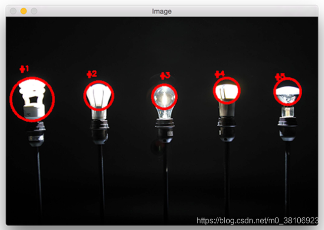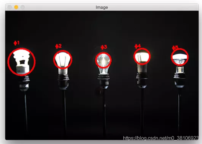 本篇博文分享一篇寻找图像中灯光亮点(图像中最亮点)的教程,例如,检测图像中五个灯光的亮点并标记,项目效果如下所示: 第1步:导入并打开原图像,实现代码如下所示: # import the necessary packages from imutils import contours from skimage import measure import numpy as np import argparse import imutils import cv2 # construct the argument parse and parse the arguments ap = argparse.ArgumentParser() ap.add_argument("-i", "--image", required=True, help="path to the image file") args = vars(ap.parse_args()) 第2步:开始检测图像中最亮的区域,首先需要从磁盘加载图像,然后将其转换为灰度图并进行平滑滤波,以减少高频噪声,实现代码如下所示: #load the image, convert it to grayscale, and blur it image = cv2.imread(args["image"]) gray = cv2.cvtColor(image, cv2.COLOR_BGR2GRAY) blurred = cv2.GaussianBlur(gray, (11, 11), 0) 导入亮灯图像,过滤后效果如下所示: 第3步:阈值化处理,为了显示模糊图像中最亮的区域,将像素值p >= 200,设置为255(白色),像素值< 200,设置为0(黑色),实现代码如下所示: # threshold the image to reveal light regions in the # blurred image thresh = cv2.threshold(blurred, 200, 255, cv2.THRESH_BINARY)[1] 效果如下所示: 第4步:此时可看到图像中存在噪声(小斑点),所以需要通过腐蚀和膨胀操作来清除,实现代码如下所示: # perform a series of erosions and dilations to remove # any small blobs of noise from the thresholded image thresh = cv2.erode(thresh, None, iterations=2) thresh = cv2.dilate(thresh, None, iterations=4) 此时“干净”的图像如下所示: 第5步:本项目的关键步骤是对上图中的每个区域进行标记,即使在应用了腐蚀和膨胀后,仍然想要过滤掉剩余的小块儿区域。一个很好的方法是执行连接组件分析,实现代码如下所示: # perform a connected component analysis on the thresholded # image, then initialize a mask to store only the "large" # components labels = measure.label(thresh, neighbors=8, background=0) mask = np.zeros(thresh.shape, dtype="uint8") # loop over the unique components for label in np.unique(labels): # if this is the background label, ignore it if label == 0: continue # otherwise, construct the label mask and count the # number of pixels labelMask = np.zeros(thresh.shape, dtype="uint8") labelMask[labels == label] = 255 numPixels = cv2.countNonZero(labelMask) # if the number of pixels in the component is sufficiently # large, then add it to our mask of "large blobs" if numPixels > 300: mask = cv2.add(mask, labelMask) 上述代码中,第4行使用scikit-image库执行实际的连接组件分析。measure.lable返回的label和阈值图像有相同的大小,唯一的区别就是label存储的为阈值图像每一斑点对应的正整数。 然后在第5行初始化一个掩膜来存储大的斑点。 第7行开始循环遍历每个label中的正整数标签,如果标签为零,则表示正在检测背景并可以安全的忽略它(9,10行)。否则,为当前区域构建一个掩码。 下面提供了一个GIF动画,它可视化地构建了每个标签的labelMask。使用这个动画来帮助你了解如何访问和显示每个单独的组件: 第15行对labelMask中的非零像素进行计数。如果numPixels超过了一个预先定义的阈值(在本例中,总数为300像素),那么认为这个斑点“足够大”,并将其添加到掩膜中。输出掩模如下图所示: 第6步:此时图像中所有小的斑点都被过滤掉了,只有大的斑点被保留了下来。最后一步是在的图像上绘制标记的斑点,实现代码如下所示: # find the contours in the mask, then sort them from left to # right cnts = cv2.findContours(mask.copy(), cv2.RETR_EXTERNAL, cv2.CHAIN_APPROX_SIMPLE) cnts = imutils.grab_contours(cnts) cnts = contours.sort_contours(cnts)[0] # loop over the contours for (i, c) in enumerate(cnts): # draw the bright spot on the image (x, y, w, h) = cv2.boundingRect(c) ((cX, cY), radius) = cv2.minEnclosingCircle(c) cv2.circle(image, (int(cX), int(cY)), int(radius), (0, 0, 255), 3) cv2.putText(image, "#{}".format(i + 1), (x, y - 15), cv2.FONT_HERSHEY_SIMPLEX, 0.45, (0, 0, 255), 2) # show the output image cv2.imshow("Image", image) cv2.waitKey(0) 最后运行程序,可实现灯光亮点的检测和标记,每个灯泡都被独特地标上了圆圈,圆圈围绕着每个单独的明亮区域,效果如下所示: 本文来源于:Detecting multiple bright spots in an image with Python and OpenCV 到此这篇关于Python+OpenCV检测灯光亮点的实现方法的文章就介绍到这了,更多相关OpenCV 检测灯光亮点内容请搜索自学php网以前的文章或继续浏览下面的相关文章希望大家以后多多支持自学php网! 以上就是关于Python+OpenCV检测灯光亮点的实现方法全部内容,感谢大家支持自学php网。 |