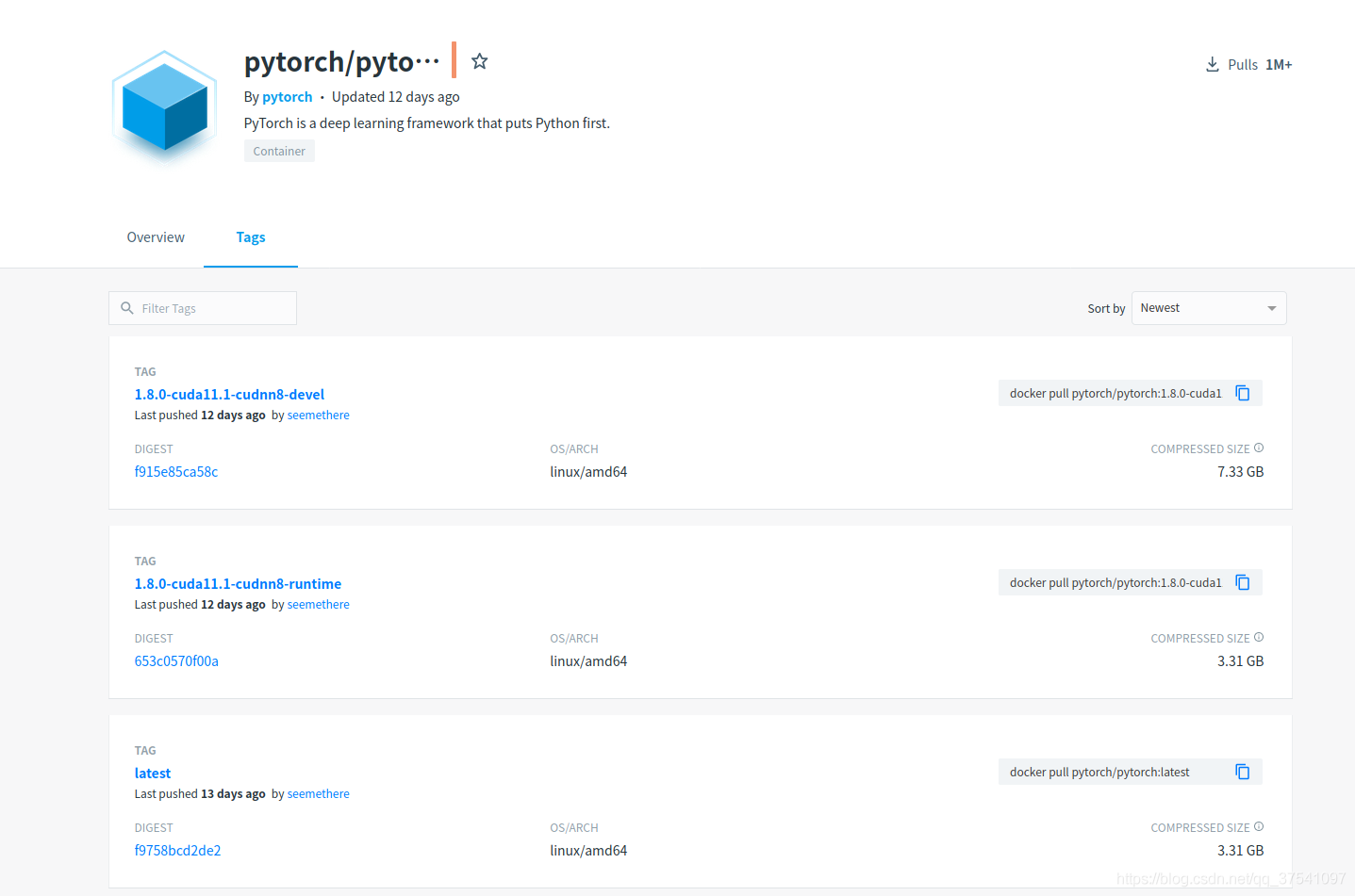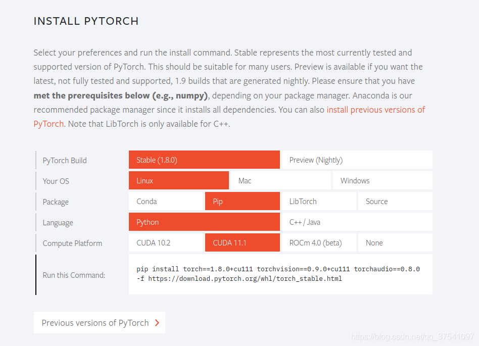 numpy==1.17.0 matplotlib==3.2.1 lxml==4.6.2 tqdm==4.42.1 如果需要退出虚拟环境,执行以下指令即可: conda deactivate 安装PyTorch1.8在线安装进入PyTorch官网:https://pytorch.org/ 我们通过选择自己的系统类型、安装方式以及CUDA的版本可以得到对应的安装指令。官方默认会顺带安装torchvision和torchaudio但我只需要torchvision所以通过以下指令安装 (注意,要进入对应的虚拟环境安装,例如上面的torch18环境): pip install torch==1.8.0+cu111 torchvision==0.9.0+cu111 -f https://download.pytorch.org/whl/torch_stable.html 安装完成后就可以使用了,不需要在单独安装CUDA,并且不会影响之前安装的CUDA版本。 下面进行简单的测试: 首先在终端输入 pyhton 然后导入 import torch torch.cuda.is_available() 如果打印的是 离线安装有些时候,可能你的设备无法连接外网,此时需要提前准备好需要安装的whl文件,那么我们这里就以 我们在这里可以找到我们需要的 进入对应虚拟环境 conda activate torch18 安装torch pip install torch-1.8.0+cu111-cp38-cp38-linux_x86_64.whl 安装torchvison pip install torchvision-0.9.0+cu111-cp38-cp38-linux_x86_64.whl 安装完成后进行简单的测试: 首先在终端输入 pyhton 然后导入 import torch torch.cuda.is_available() 如果打印的是 通过docker安装在有些情况下是需要使用docker来跑深度学习环境的(现在很多大公司都是使用paas平台来部署的)。那么我们就需要使用pytorch官方的docker镜像了。我们可以在docker hub上去搜索相关镜像,https://registry.hub.docker.com/。下图是我搜索的pytorch字段的结果(点击Tags后)。 我们可以看到当前最新的docker 镜像有 1)我们直接通过以下指令就能pull这个镜像了 docker pull pytorch/pytorch:1.8.0-cuda11.1-cudnn8-runtime 2)注意,在启动镜像前需要确保已安装 distribution=$(. /etc/os-release;echo $ID$VERSION_ID) \ && curl -s -L https://nvidia.github.io/nvidia-docker/$distribution/nvidia-docker.repo | sudo tee /etc/yum.repos.d/nvidia-docker.repo 安装 首先根据你的系统类型以及版本下载对应 distribution=$(. /etc/os-release;echo $ID$VERSION_ID) \ && curl -s -L https://nvidia.github.io/nvidia-docker/$distribution/nvidia-docker.repo | sudo tee /etc/yum.repos.d/nvidia-docker.repo 清空yum的过期缓存数据(如果不是root用户需要加sudo) yum clean expire-cache 安装 yum install -y nvidia-docker2 重启docker服务(如果不是root用户需要加sudo) systemctl restart docker 3)通过docker启动pytorch1.8.0容器 docker run --gpus all --rm -it --ipc=host pytorch/pytorch:1.8.0-cuda11.1-cudnn8-runtime 4)进入容器后可以通过 5)接着进入python环境简单测试下pytorch能否正常调用GPU(打印True为成功) import torch torch.cuda.is_available() 到此这篇关于Linux安装Pytorch1.8GPU(CUDA11.1)的实现的文章就介绍到这了,更多相关Linux安装Pytorch GPU 内容请搜索自学php网以前的文章或继续浏览下面的相关文章希望大家以后多多支持自学php网! 以上就是关于Linux安装Pytorch1.8GPU(CUDA11.1)的实现全部内容,感谢大家支持自学php网。 |