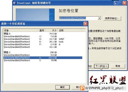 第 2步:选择设备。一路选择“加密非系统分区/设备→隐藏的TrueCrypt加密卷→常规模式”,此时,请单击“选择设备”来选择移动硬盘的第2个分区, 如图2所示。显然,它以盘符(比如K盘、I等)和“DeviceHarddisk XPartition X”两种形式来标识分区,就算盘符被隐藏,还可通过另一种方式来选择要加密的分区,在后面的“加密技巧”部分,我们将用到这一特性。其 中,DeviceHarddisk 2Partition 2表示的就是移动硬盘的第2个分区。