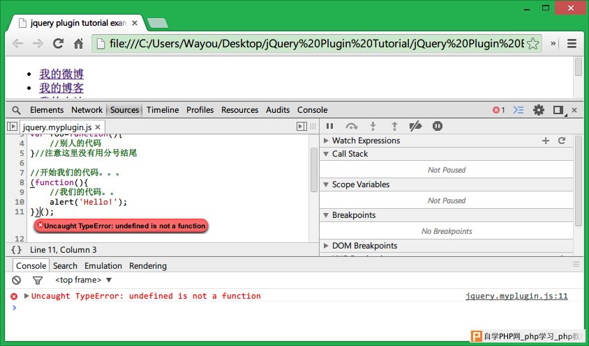 原因是我们用来充当自调用匿名函数的第一对括号与上面别人定义的函数相连,因为中间没有分号嘛,总之我们的代码无法正常解析了,所以报错。