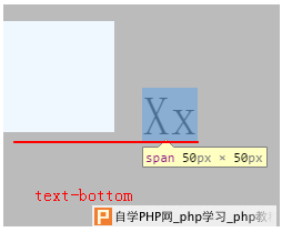 最终效果就是盒子的顶端与父盒子文本区域顶端对齐。 4、text-bottom 将盒子的底端(margin-bottom边界) 与父盒子的文本区域底端对齐 和text-top类似,不过将子元素的margin-bottom和文本区域的下边界对齐。