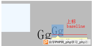 分析: 父元素.ctn-block的base-line是Gg的baseline, inline-block元素因为没有内部line box,也没有设置overflow:visible,所以其baseline是底margin边界。 四、vertical-align基于baseline的不同取值 1、baseline 将子元素盒子的baseline与父盒子的baseline对齐。