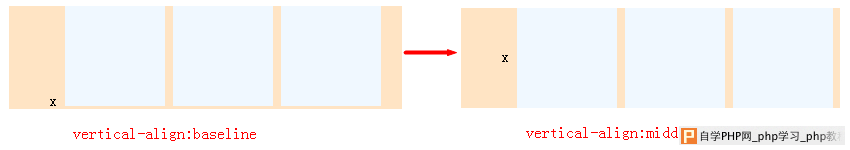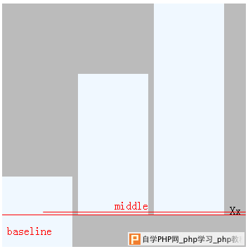 2、middle 将元素盒子的垂直中点与父盒子的baseline加上父盒子的x-height的一半位置对齐 这里元素盒子的垂直中点容易确定,父盒子的baseline也好确定,但是x-height要进行计算得到,这个x-height就是字母x的高度。