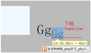 5、sub 将子元素盒子的baseline降低,到适当的父盒子的下标位置 子元素的baseline已经确定了,就是margin-bottom下边界,但是父盒子的下标位置太不好理解。。。首先需要了解下标这个概念,我们可以通过<sub>标签为文字添加下标,将<span>中的内容修改为Gg<sub>Gg</sub>,就会有如下效果。
