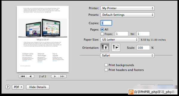 Mac怎么打印文件?设置打印机之后,用户到底该怎么打印文件呢?又怎么利用mac打印pdf文件呢?其实很很简单,您只需从可以打印的任何 app 中选取“文件”>“打印”。您还可以按 ⌘P (Command-P) 快捷键。打印文稿时,OS X 会显示打印表单,您可以从中为打印作业设置其他选项。下面就和脚本之家小编一起来看看Mac打印文件的详细教程吧。 基本打印表单提供以下选项: 从“打印机”弹出式菜单中选取目标打印机。如果未看到自己的打印机,请从此菜单中选取“添加打印机”。 从“预置”菜单中选取打印作业适用的打印机预置。预置是打印机功能选项的预先配置组合。 在“份数”字段中输入打印机应打印的份数。 通过“页面”字段选择您要打印的页面,包括打印单个页面、所有页面或具体范围的页面。 打印表单还包括打印作业的预览(如果 app 支持此功能)。打印前,在预览模式下使用箭头查看打印作业的每个页面。 点按打印表单左下角的“帮助”按钮 (?) 可查看有关打印的更多信息。 使用 PDF 按钮可创建 PDF 版的打印件,而不是物理打印。按住该按钮可查看带有其他选项的菜单。 点按取消即退出打印表单,而不要打印。 点按“打印”即表示接受您当前的打印设置,并将您的文稿发送到打印机。点按后,您的打印作业会立即出现在打印机队列中。 点按“显示详细信息”按钮可以就如何处理您的打印件进行更多操控。 除了标准打印表单中显示的详细信息外,“详细信息”表单还提供以下选项: 选取“纸张大小”菜单以根据打印输出的大小来匹配打印机中的纸张。您也可以在此处创建并管理自定纸张大小。 通过“方向”按钮,您可以选取纵向或横向输出。 通过更改“缩放比例”字段中的值来调整打印输出内容的大小。打印预览会根据您所做的缩放更改进行相应的改变。 “应用软件和打印机设置”菜单的内容取决于使用的打印机和应用软件。显示在此菜单中的与打印机有关的特定功能 使用“预置”菜单中的“存储预置”选项来保存您当前的设置,这样您可以轻松地将它们应用到将来的打印作业。 点按“隐藏详细信息”可将打印表单恢复为较短的标准视图。 提示:您的图像不需要大于每英寸 360 点 (dpi)。尝试打印大于该分辨率的图像需要的打印时间较长,在启动驱动器上使用的空间也较多,而打印质量没有任何明显变化。 其他打印选项 您还可以管理您的打印作业,并直接打印到 PDF 文件(而不是打印机)。点按下面的任一主题以了解更多信息。 生成和管理 PDF 以 PDF 格式预览打印作业或将其存储为 PDF 文件(带元数据)。 点按任意打印机表单中的“PDF ▾”按钮,即会显示 PDF 工作流菜单,其下拉菜单中包含下列选项: “在‘预览’中打开 PDF”– 生成打印作业的 PDF 文件并在应用软件“预览”中将其打开。 “存储为 PDF...”– 创建打印作业的 PDF 文件并存储到所选目标位置,并可向 PDF 添加元数据(标题、作者、主题和关键词)。当您使用 Spotlight 时,元数据很有用。 需要密码才能打开文稿 需要密码才能拷贝文本、图像和其他内容 需要密码才能打印文稿 点按“安全性选项”会打开“PDF 安全性选项”对话框,其中提供以下选项: “存储为 PostScript...”– 生成打印作业的 PostScript 文件并存储到所选目标位置。 “传真 PDF”– 生成打印作业的 PDF 文件并将其发送到传真设备以进行传送。注:需要与 OS X Mountain Lion 或 OS X Lion 兼容的第三方传真设备。 “邮寄 PDF”– 将生成的打印作业 PDF 文件附加到新建的电子邮件文稿中。添加电子邮件收件人并进行发送。 “将 PDF 存储至 Web Receipts 文件夹”– 将生成的打印作业 PDF 文件存储到“~/文稿/Web Receipts”文件夹。 “编辑菜单...”– 添加/删除打印工作流。请查看 Automator 了解有关如何创建新打印工作流的信息。 管理打印机队列和打印机 Dock 图标 打印作业开始后将立即显示打印机 Dock 图标。点按打印机 Dock 图标以打开打印机队列,打印机队列是正在打印、等待中或已暂停的打印作业列表。打印队列还将显示来自打印机的信息;例如,“打印机现尚未连接”。 按住 Control 键的同时点按该图标将显示打印机队列的 Dock 菜单,如图所示。 打印机队列图标上的标签包括: 带数字的红色标签表示打印机队列中的打印作业数量,以上示例表示存在两个打印作业。 带暂停符号的绿色标签表示打印机队列已暂停,如上所示。注:打印机队列恢复后将不再显示绿色图标。 带闪电图标的黄色标签表示打印机出现问题;例如,打印机当前未连接到 Mac。 您也可从“系统偏好设置”的“打印与扫描”面板中打开打印队列。以下是打印队列示例: 从打印队列中,您可以执行以下操作: 删除 – 删除打印作业 暂停/继续 – 暂停或继续打印作业 作业信息 – 点按以查看打印作业的打印机选项 暂停/继续 – 暂停或继续打印机队列 耗材余量 – 点按以查看打印机的耗材余量;选项因打印机型号不同而异 打印机设置 – 点按以查看打印机队列命名选项和其他选项;这些选项取决于打印机型号 打印机/扫描仪 – 连接到“多功能打印机”时显示。在两个按钮间切换可从“打印机队列”切换到“扫描仪工具”。请参阅此文章了解扫描详细信息。 提示:点按某个打印作业以将其高亮显示,然后按下空格键以“快速查看”打印作业;或者,点按作业名称