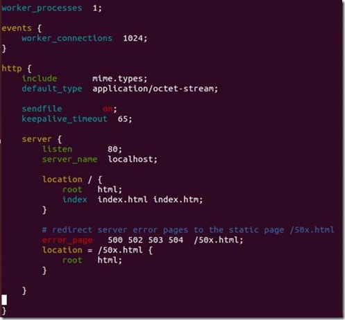 2.Nginx配置安装完成之后,配置目录conf下有以下配置文件,过滤掉了xx.default配置: tyler@ubuntu:/opt/nginx-1.7.7/conf$ tree |grep -v default . ├── fastcgi.conf ├── fastcgi_params ├── koi-utf ├── koi-win ├── mime.types ├── nginx.conf ├── scgi_params ├── uwsgi_params └── win-utf