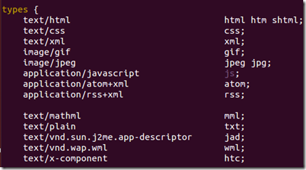 这也是上面在浏览器中输入http://localhost,能够显示欢迎页面的原因。实际上访问的是/opt/nginx-1.7.7/html/index.html文件。 2.2.mime.types文件扩展名与文件类型映射表,nginx根据映射关系,设置http请求响应头的Content-Type值。当在映射表找不到时,使用nginx.conf中default-type指定的默认值。例如,默认配置中的指定的default-type为application/octet-stream。 include mime.types; default_type application/octet-stream; 默认 下面截一段mime.types定义的文件扩展名与文件类型映射关系,完整的请自行查看: