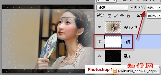 10.单击“白底”图层,将图层不透明度设置为65%。并按下CTRL+T,自由变换,按下SHIFT+ALT键,将白底进行变换,使其上面和下面显示出下面星光图层。