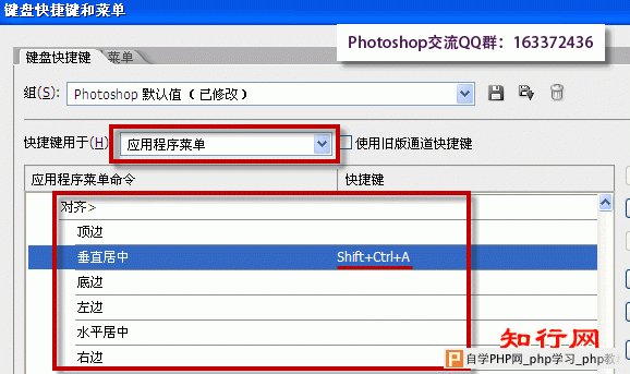 不过,这样的组合键,很难记住。由于笔者工作中对垂直居中经常使用,因此自己设定了PS对齐快捷键:垂直居中:Shift+Ctrl+A。
