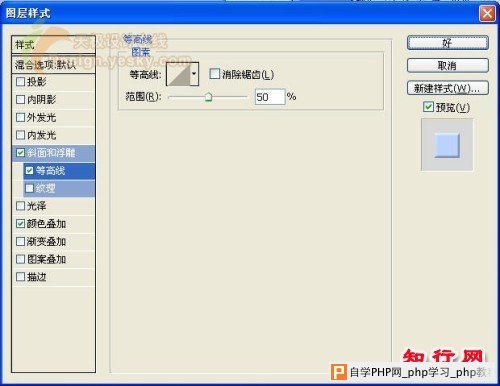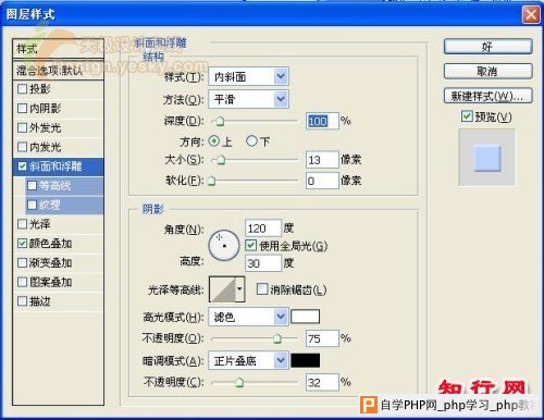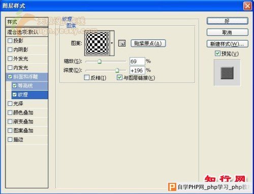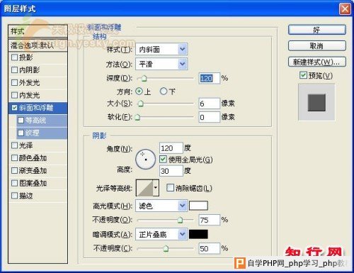 5、双击图层1,在打开的图层样式对话框中设置图层样式,选择“斜面和浮雕”样式,参数设置如图06-08所示。
