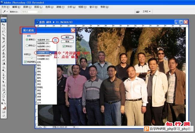 8. 在“照片滤镜”对话框里点“滤镜”栏右边的小三角“v”出现下拉菜单后,选定“冷却滤镜(80)”,如下图: