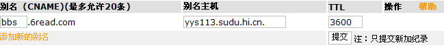 从上图中的“IP地址”栏里可以看到,我的双线空间除了有一个电信IP和一个网通IP以外,还有一个“智能解析CNAME ”的地址为“yys113.sudu.hi.cn. ”这个地址就是用来做CNAME记录的。 回到域名的管理页面,我以bbs.6read.com为例,在“别名 (CNAME) ”里点击“添加新的别名”,如下图所示: