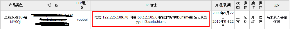 在上一贴中的域名解析里只是讲到了A记录的解析,A记录适合空间是电信或者网通这样的单线程的空间,这样的空间一般只提供了一个IP,所以必须使用A记录来解析。但是如果你是在超视野购买的双线空间,由于空间有电信和网通两个IP,这样就可以实现不同用户的高速访问;那么解析域名的时候就需要使用别名(CNAME)记录了。 以我在超视野的空间为例,登陆空间管理,可以看到空间的IP信息: