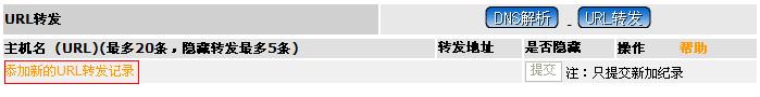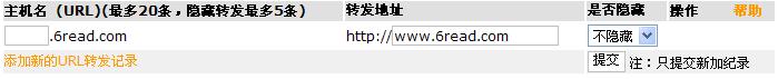 在域名前面填入“bbs",在“别名主机”栏里填入空间提供的智能CNAME地址“yys113.sudu.hi.cn. ”。这里需要注意的是,CNAME地址后面都有一个“."号,在输入的时候千万不要忘了把这个点给输入进去,如果忘了将有可能无法成功解析。输入完毕后点击“提交”。 别名(CNAME)记录解析完毕以后去买空间的地方,登陆空间管理后台,将解析的域名绑定空间,绑定空间的方法都是一样的,在前一贴中已经讲过了,在这里我就不在讲了。如果还有不会的可以去“新手建站每日一贴②:域名的解析与绑定”查看。 ②URL的转发与设置方法: 什么是URL转发,URL转发的好处是什么? 转发顾名思义就是转到另一个地址,大家都知道要打开一个站,在地址栏里输入带“www"地址和不带“www"的地址都可以访问。比如我的卓越网上书店,你输入www.6read.com ,可以进入我的站,输入6read.com ,也一样可以访问我的网站,那这是这么实现的呢? 要实现这样的方法有两个,第一种就是将带www的域名和不带www的域名都解析到空间上;但是这样的话百度等搜索引擎会将你这两个域名认为是两个站,这样一来就出现了完全重复的内容,所以,对SEO不是很好。 第二种方法就是使用URL转发,例如将我的6read.com使用URL转发到www.6read.com上,这样一来访问6read.com的时候就会直接跳转到带www的域名上,而且这种跳转方式搜索引擎是认可的。既解决了用两种方式都可以访问站点,又不会出现重复内容。URL转发还可以使用在多域名上,例如谷歌中国的www.g.cn就是使用的url跳转直接跳转到www.google.cn的。 下面就来讲解一下URL转发的设置方法: 1)、进入URL转发设置页面; 2)、点击上面的“添加新的URL转发记录”; 3)、因为我是要将6read.com转发到www.6read.com,所以我在“主机名(URL)”栏里留空,在“转发地址”栏里填入了www.6read.com,在是“否隐藏”里选择了不隐藏然后点击“提交”: 这样URL转发就设置完毕,生效后在浏览器的地址栏里输入6read.com,就会自动跳转到www.6read.com了。 需要说明的是“是否隐藏”,有的地方如果选择不隐藏跳转之后能正常访问站点,但是在地址栏里会看到跳转前的地址,隐藏了以后则不会;但是有的地方要隐藏的话需要提交传真之类的申请,非常麻烦;反正我们要实现的是能正常跳转,是否隐藏不影响我们的跳转,所以没必要太在乎是否隐藏。 好了,今天就到这里。今天的总结:为大家讲解了“别名 (CNAME)"记录的设置和“url转发”的设置。 明天的预告:一个空间可不可以放置两个网站,如果可以需要具备什么条件,该怎么设置?明天为大家讲解子目录的绑定。 |