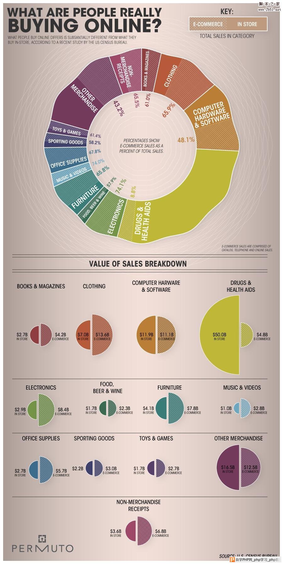 美国统计局的一项研究数据显示,在商品销售总额方面,由线下占据多数;不仅如此,在每个单独的品类上,也大都是线下购买多于线上购买。然而在有几个商品品类,线上购买占据了主导位置。这些品类包括:书籍和杂志,服饰,电子产品。