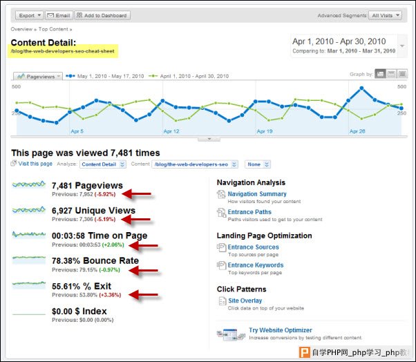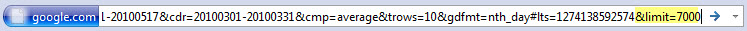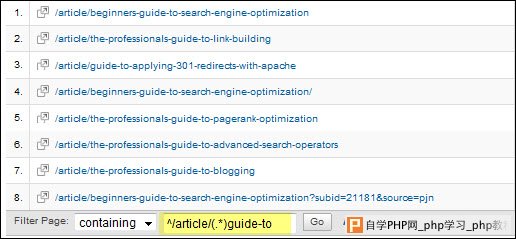 这个正则表达式能够让我搜索到所有以“/article”为起始并包含“guide-to”的Urls 4. 在Google Analytics中展示更多行内容吧 如果你拥有一个庞大的站点,我非常确信你在试图导出所有你的数据时会有这样的麻烦,每次最多只能下载500条数据!假设你有10000以上的数据需要弄到表格里,这个限制简直就成了噩梦。这个小窍门能够帮你省去的时间可以用小时为单位来计算。 只需要将这段参数加到URL的末尾即可:“&limit=”。(这是它唯一的作用),然后你将得到你在&limit=后输入的数字对应的所有数据。虽然在页面上仍然只显示500条(或是他本身设置的数字)但当你真的下载时,将会得到你所需要的所有数据了!BTW:在Excel 2005或更早版本中,这里你要考虑到一个关于Excel最大行数的限制。 1、通常,你一次最多只能选择500行