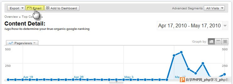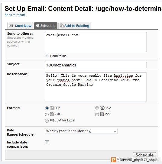 5. 可以制作一份定时发送的邮件报告 或许很早以前我们就看到过这个功能,并且收到过这些报告,但诚实的来说直到现在我也没思考过如何让它们对我的站点服务。这玩意对于你定期要发送的报告是极有用的(日报/周报/月报),并且对于那些没有访问GA权限的用户来说也非常方便。还可以使用“添加至现有”功能发送一份集成了很多数据的报告,再也不用令人在看报告时总有那种收到垃圾邮件的感觉了。 另一个令人惊艳的功能是你设定的日期范围拥有继承特性,就是说第一份报告你设置显示的数据是前30天的话,那么下一封邮件则会自动选择相应的前30天数据发送给你。嘿嘿,不错。