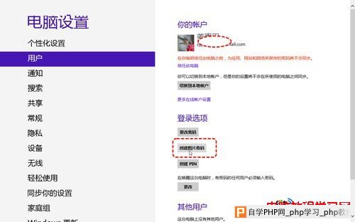 2.在右侧“登录选项”下点击“创建图片密码”,然后按照屏幕上的说明操作,看截图: