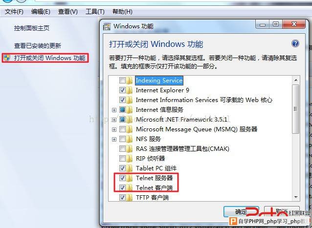 这时请确认已经开始了telnet功能。打开控制面板->卸载程序->打开或关闭windows功能->勾选Telnet服务器和Telnet服务端->确定