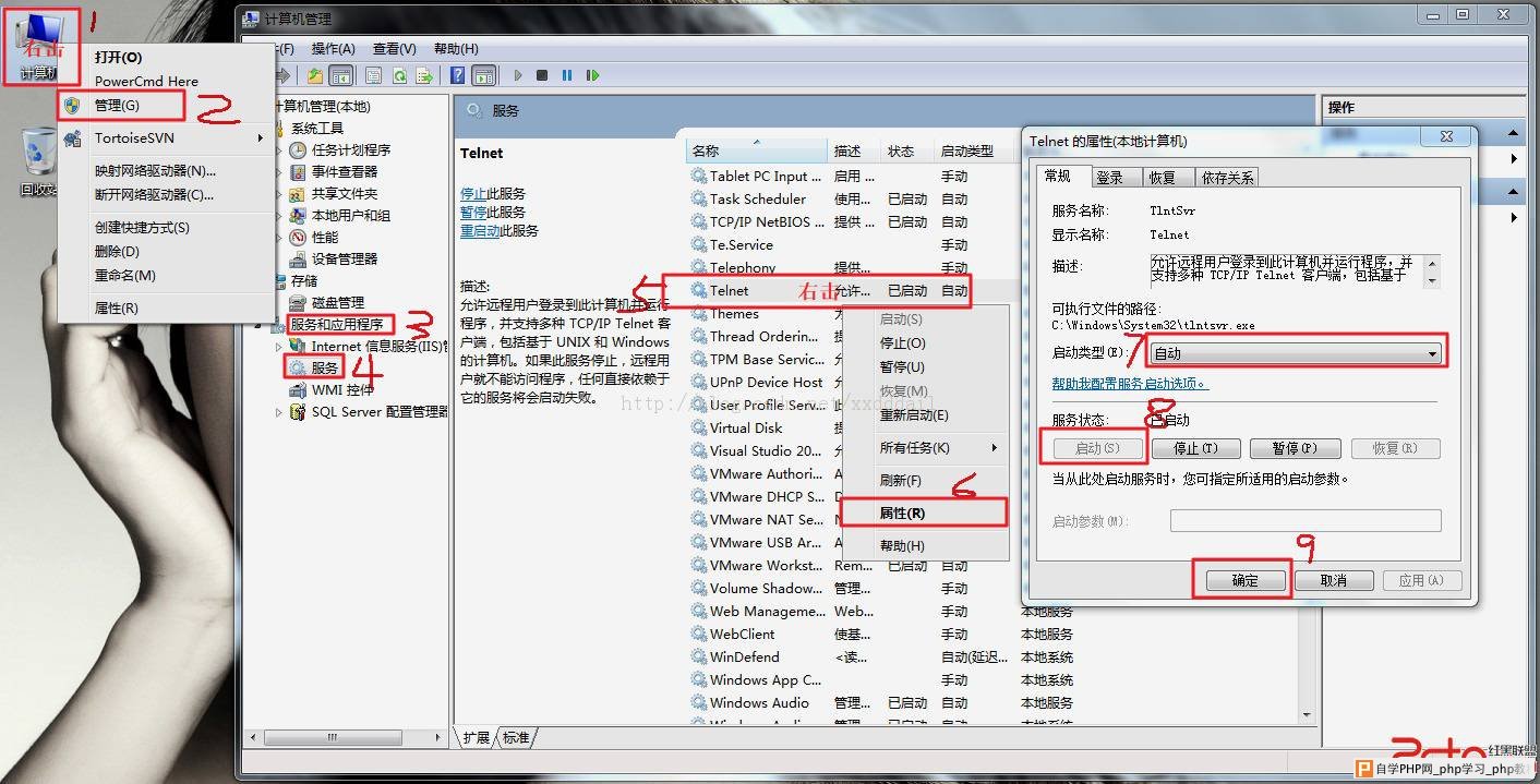 ![]() 如果不成功,可能是telnet服务并没有开启。(有的系统telnet功能虽然已经打开了,但是telnet依然连接不上,提示:connect refuse或者在端口 23: 连接失败),也可能是这个原因,下面是开启的步骤。(图中的数字为步骤的顺序,有注明右击的为鼠标右击,没有的是鼠标左击,或者下接选择对应的项。)
